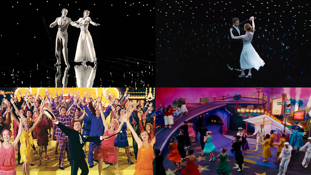 Abajo podemos ver las similitudes tanto cromáticas como de puesta en escena de esta secuencia de ‘Cantando bajo la lluvia’ (izq.) y el epílogo de ‘La La Land’ (der.)
